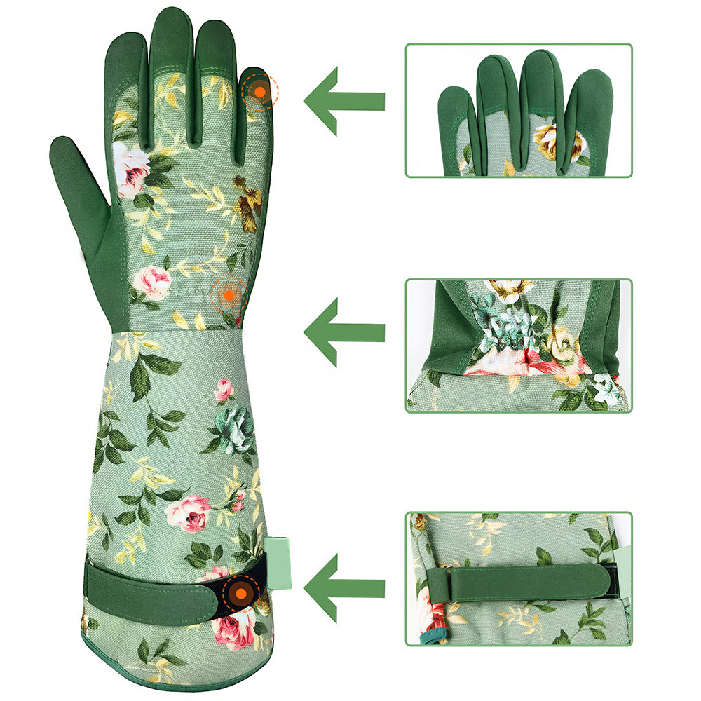 Women’s Long Gardening Gloves, Durable Leather, Green Floral Print